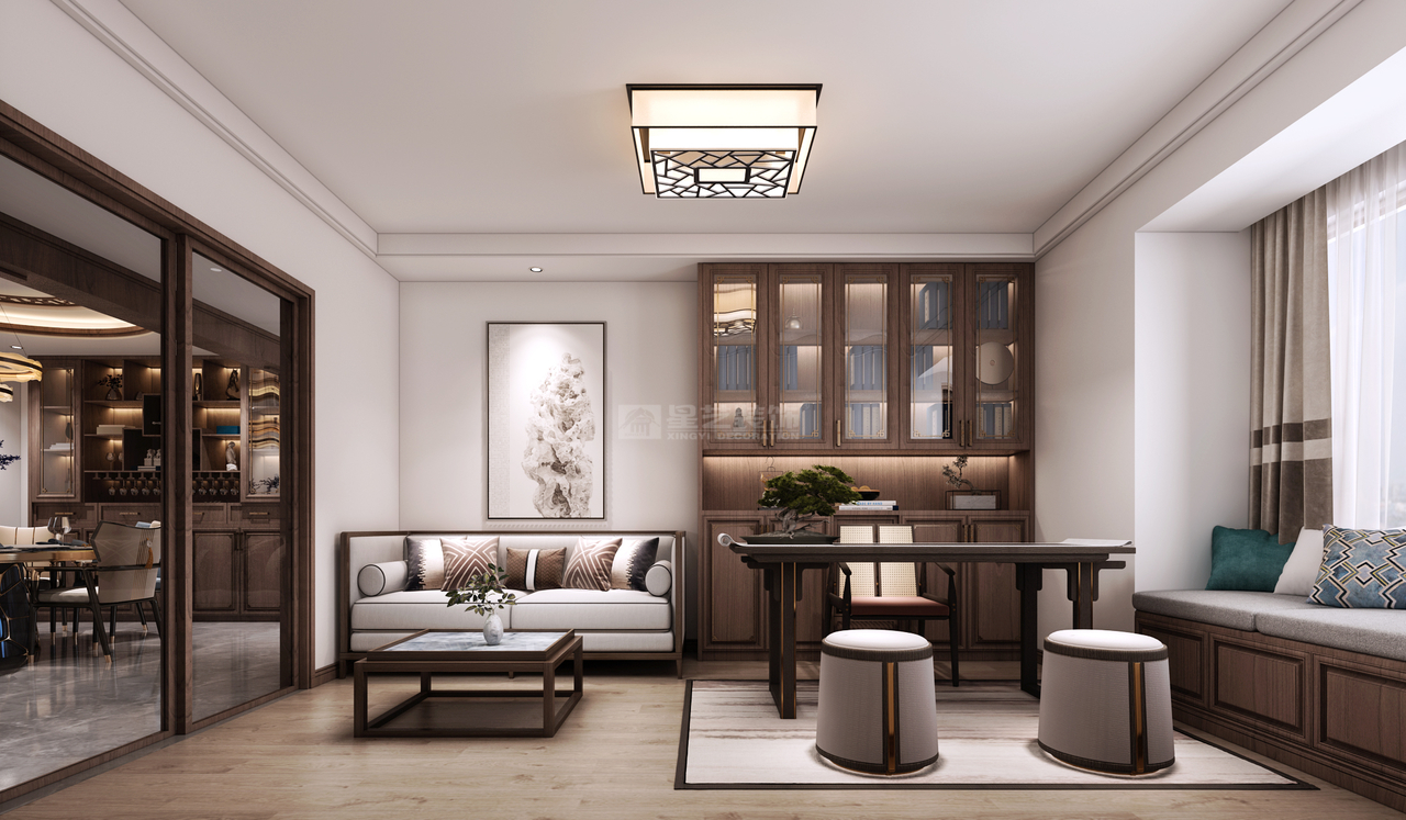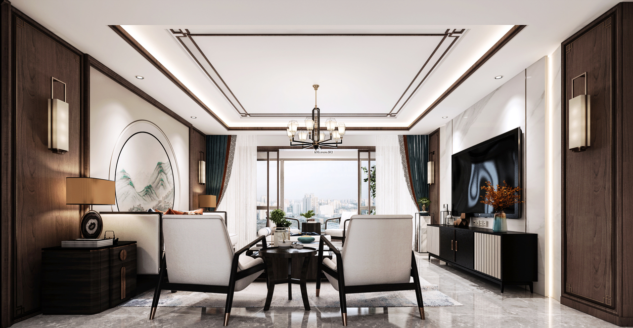 本案例是位于中天富茂轩的一个大平层设计,房子是为退休养老准备的,舒适安逸,贴近生活,实用方便,整体风格偏向新中式。 开放式客餐厅,保持空间通透感,观景阳台和多功能房的设置,满足办公休闲需求,卧室套房设计,便于日常生活,隐私性较好。